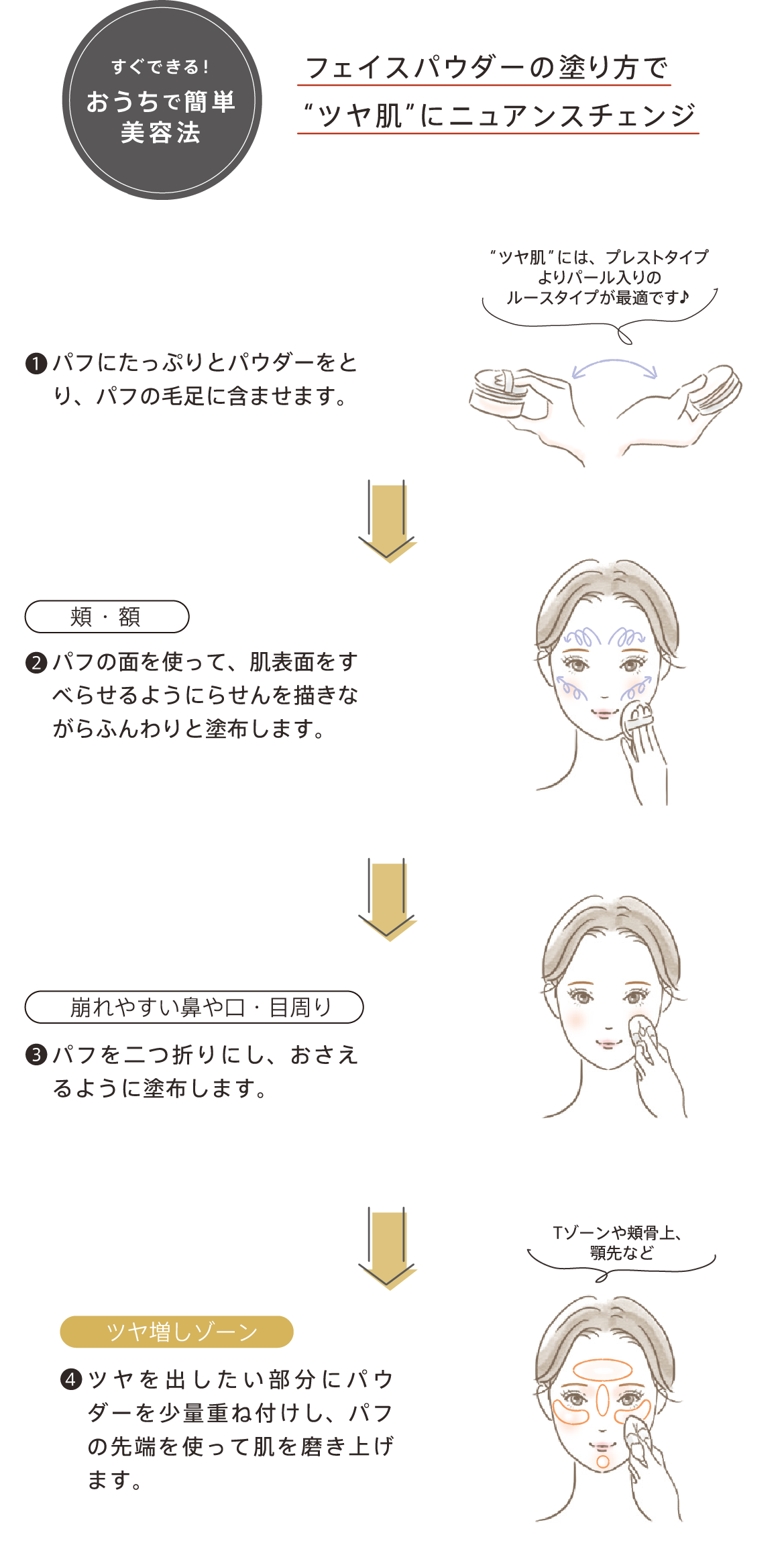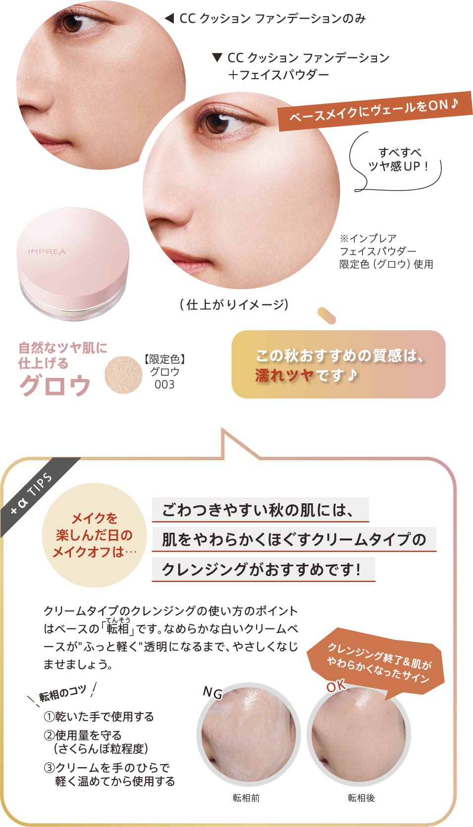 フェイスパウダーは、肌に美しい質感を与え、化粧もちを高めるベースメイクの仕上げに欠かせないアイテムです。この秋おすすめの質感は、濡れたようなツヤ感です♪いつものベースメイクの後にふんわり纏うだけで、肌の質感を秋の装いにニュアンス