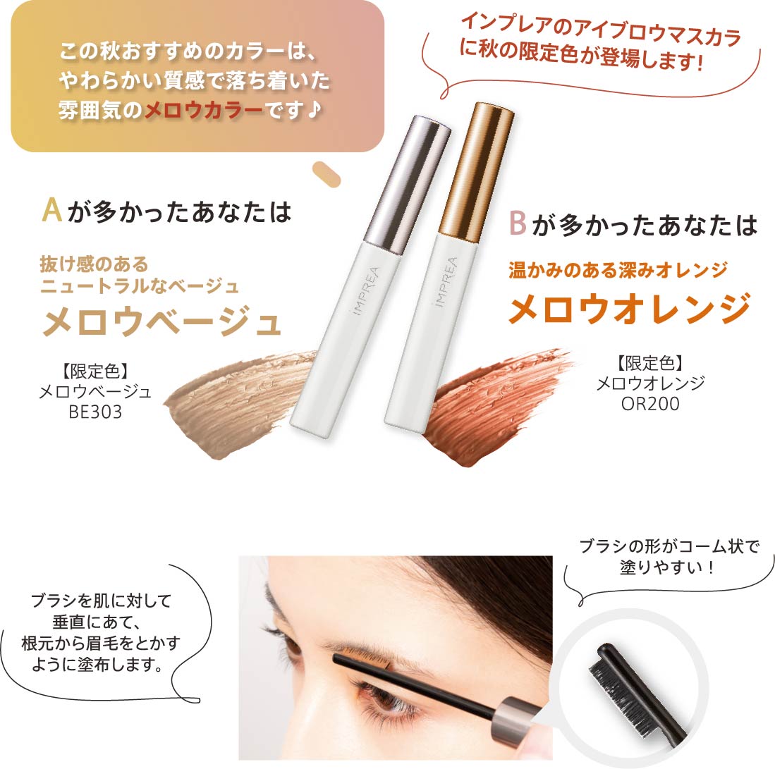 アイブロウマスカラは眉毛の色を変え、毛流れをととのえて立体感を演出できる眉メイクの仕上げに欠かせないアイテムです。いつもの眉メイクの後にひと塗りするだけで、お顔の印象をニュアンスチェンジできます!